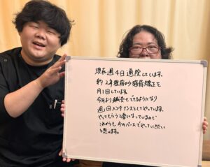 現在週4日通院しています。約2年程前から猫背矯正を月1回しています。今月より鍼灸も出来るようになり週1回メンテナンスとしてやっています。やってもらうと楽になっているのでこれからも今のペースでやっていきたいと思います。