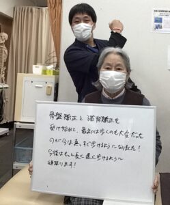 骨盤矯正と猫背矯正を受け始めて最初は歩くのも大変だったが今は真っすぐ歩けるようになりました!今後はもっと長く速く歩けるように頑張ります!